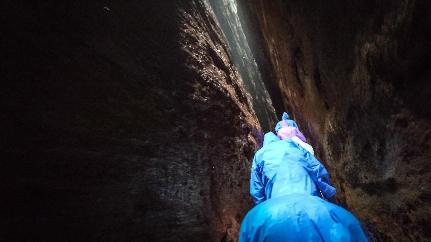 午后,我們前往一線天峽谷,于幽深巖縫間貼身而行,最窄僅30厘米,全員“身材檢測”,雖成“人墻”,卻筑起團隊信任之墻。